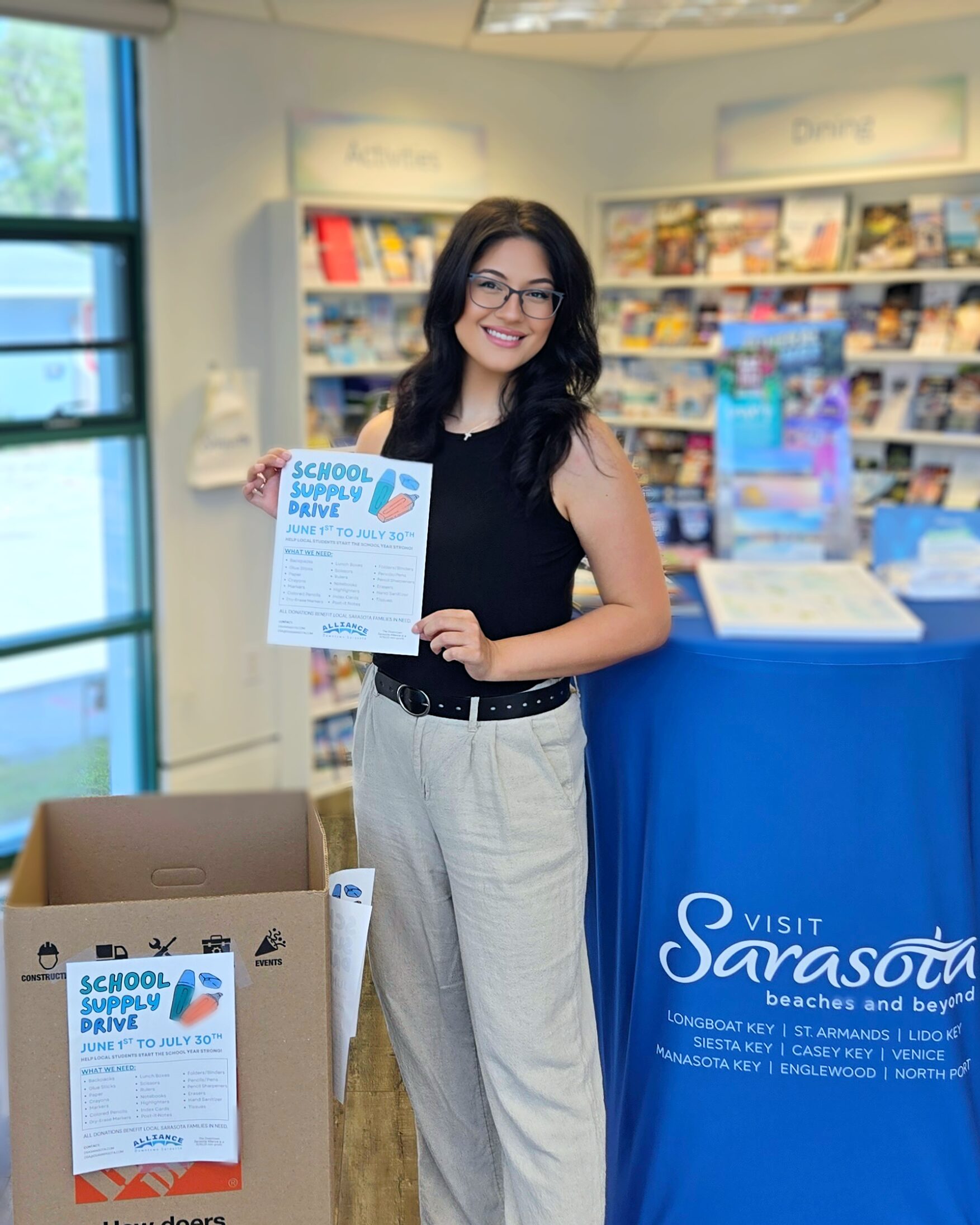 Each summer, the Downtown Sarasota Alliance hosts its annual Back to School Drive to help local students start the school year prepared. Participating DSA member businesses place collection boxes in their locations where visitors can donate new school supplies.